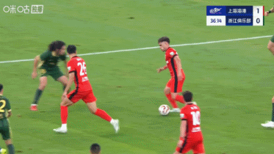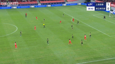 比賽第31分鐘,劉若釩禁區(qū)前轉(zhuǎn)身左腳抽射擊中立柱,場(chǎng)上比分海港1-0浙江。