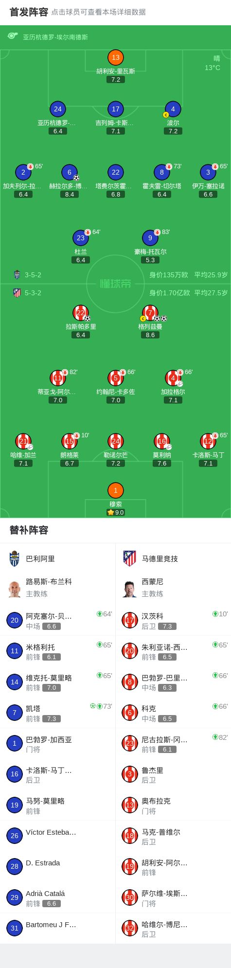 北京時間12月18日西甲日報,西班牙國王杯第三輪展開較量,巴利阿里迎戰馬德里競技。比賽中,格列茲曼接加拉格爾的助攻率先打破僵局,為馬德里競技取得領先。隨后莫利納送出助攻,拉斯帕多里破門擴大比分。巴利阿里迅速作出回應,赫拉爾多-博內特攻入一球,為球隊扳回一城。下半場,哈維-加蘭助攻格列茲曼再入一球,完成梅開二度。此后豪梅-托瓦爾主罰點球未能命中,錯失縮小分差機會。臨近比賽結束,凱塔主罰點球命中,幫助巴利阿里追至一球差距。最終全場比分為巴利阿里 2-3 馬德里競技。