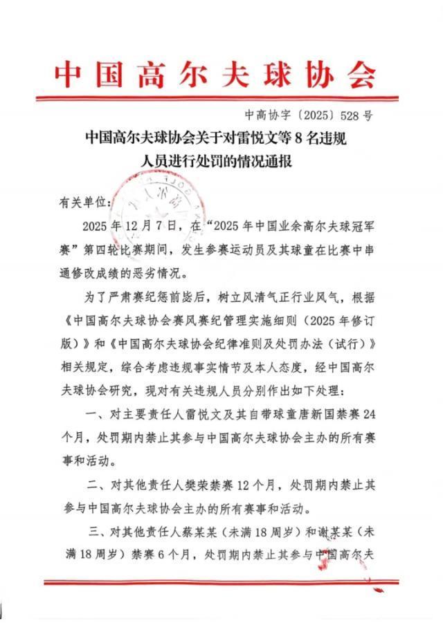 12月19日訊 中國高爾夫球協會發布情況通報,在“2025年中國業余高爾夫球冠軍賽”第四輪比賽期間,發生參賽運動員及其球童在比賽中串通修改成績的惡劣情況,對涉事人員處以最高禁賽2年的處罰。