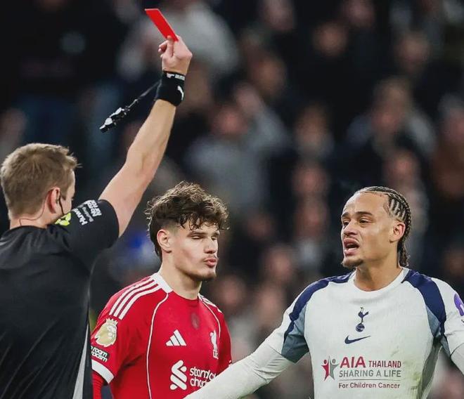 這場比賽的戲劇性,從第30分鐘就注定拉滿。熱刺10號哈維·西蒙斯在逼搶中蹬踏范戴克小腿,主裁判先出示黃牌,經VAR介入后改判直紅罰下。這本該是利物浦掌控全局的開始,卻沒想到成了“混亂模式”的啟動鍵。補時階段,羅梅羅拼搶后的附加動作吃到第二張黃牌,兩黃變一紅離場,熱刺就此淪為9人作戰。數據統計顯示,這是2007年10月以來,首支在對陣利物浦的英超比賽中吃到兩張紅牌的球隊,熱刺用最魯莽的方式,續寫了對紅軍的悲情歷史。
