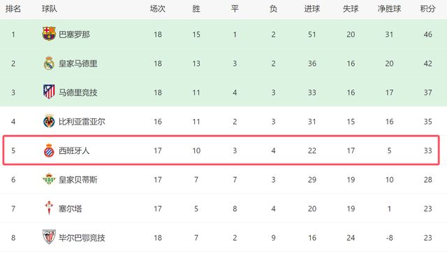 本場過后,西班牙人在西甲已經迎來5連勝,他們是除了巴薩之外,西甲近期狀態最好的球隊。截至目前,西班牙人繼續排名第五,他們只落后第四的比利亞雷亞爾2分,和第三的馬競也只差4分。如果西班牙人繼續保持狀態,他們甚至有希望競爭前三。